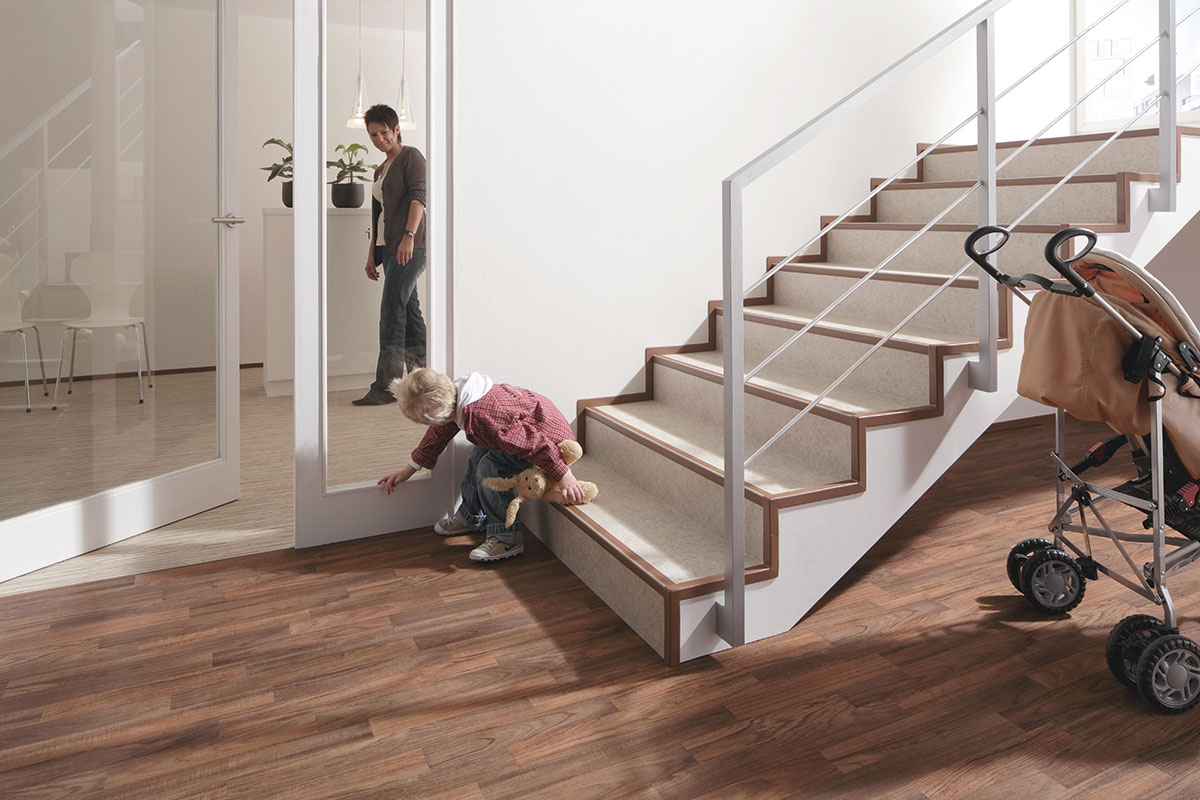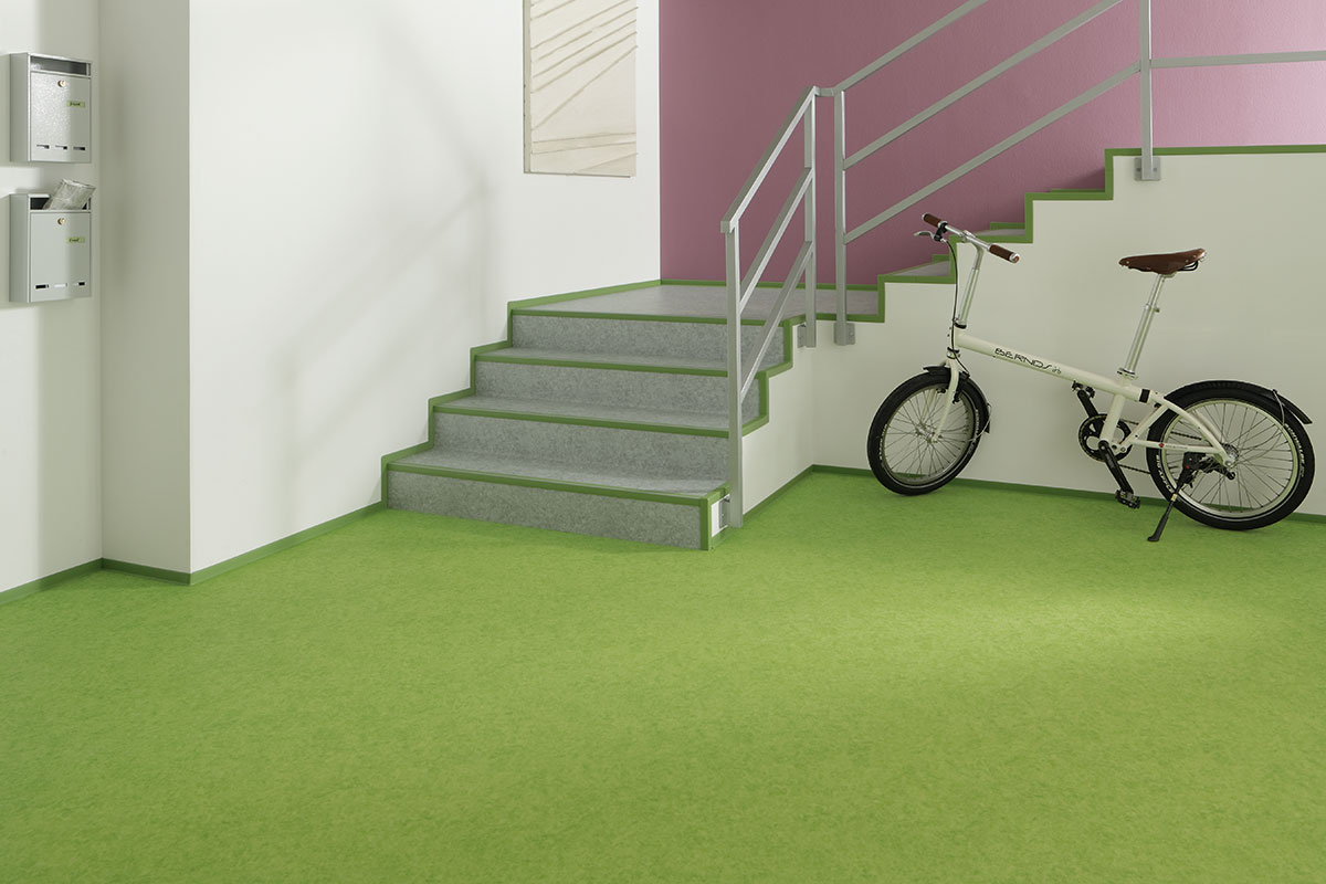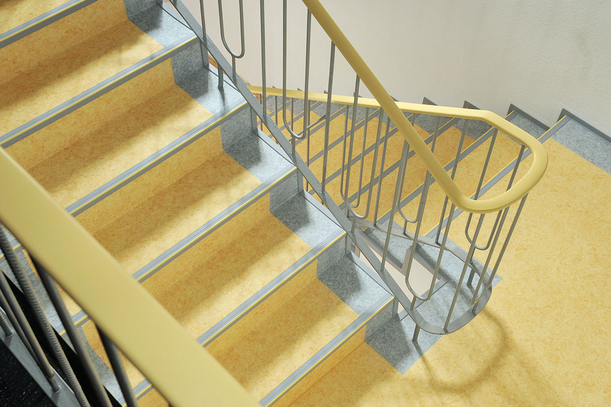 Besonders deutlich wird hier, welche Vorteile die umfangreiche, aufeinander perfekt abgestimmte Produktpalette von Altro für den Kunden bietet. Denn nicht nur das Material im Treppenhaus von Podesten und Stufen passt perfekt in Farbe, Funktion und Qualität, da das Material für Treppen und Bodenbelag in Dessau auf der selben Anlage produziert wird.