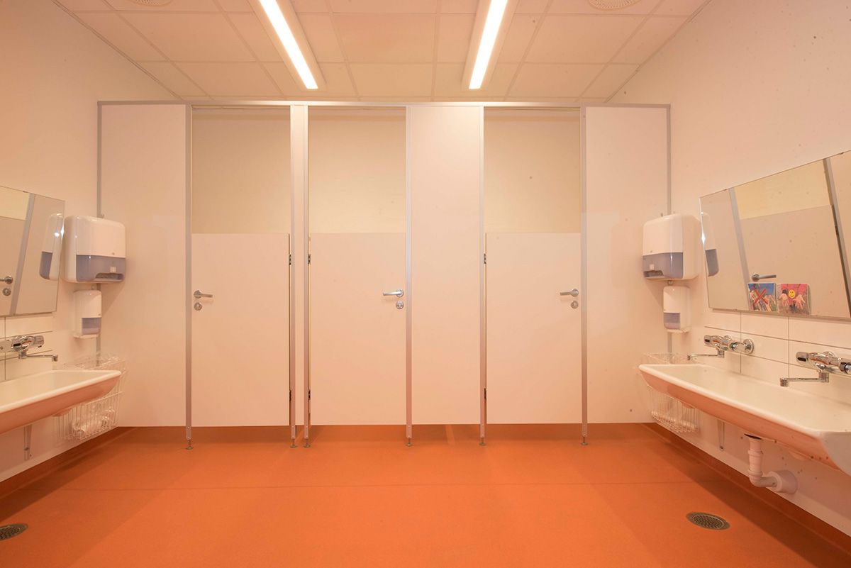 Til gulvet i det kombinerede toilet- og puslerum har institutionen valgt en stærk orange nuance for at skabe designmæssig kontrast til de andre rums mere neutrale farvesætning og give rummet sin helt egen karakter. En del af Kolbøttens pædagogiske idégrundlag er nemlig, at læringen skal tage afsæt i kroppen, og mange af aktiviteterne med børnene foregår derfor på den robuste orange gulvflade.
