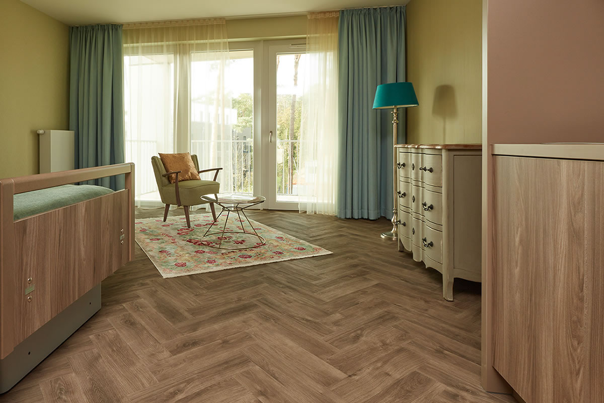 Wolfgang Biestle från W. Biestle e. K., planeringskontor för seniorboenden i Villingen, valde modulgolvet Altro Ensemble i gråbrun ek som installerades i fiskbensmönster. Detta utseende tillsammans med den 15 dB ljuddämpande effekten som Altro Ensemble ger, kombinerar estetiken i personliga hem med de funktionella kraven på vårdhem.