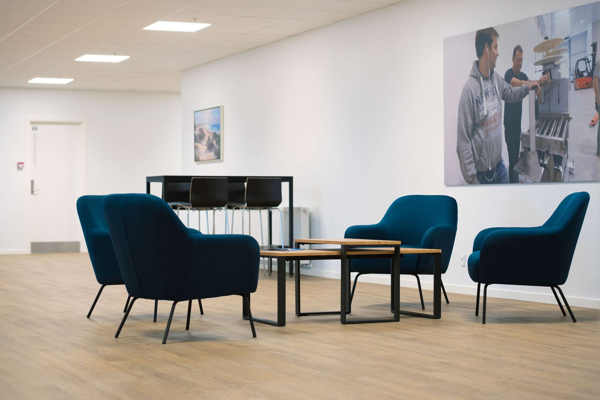 The floor is made of vinyl, but resembles wooden planks, giving us a floor that works functionally and aesthetically. This type of solution is crucial in making the workplace function well in everyday life.