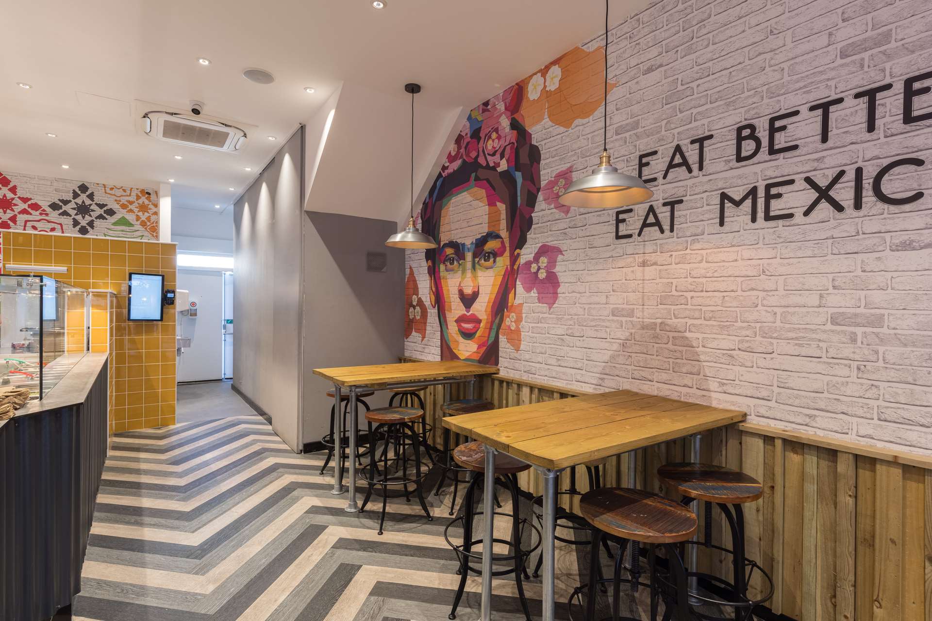 Harriet Lazzeri of Lazzeri Creative Interiors was looking to update the styling of Mexican street food restaurant El Mexicana and promote their new Don Churro desserts brand. As part of the addition of Don Churro to the brand, they were looking for a quirky and colourful backdrop to the servery counter that was easily customisable from site to site and offered a practical and hygienic solution.