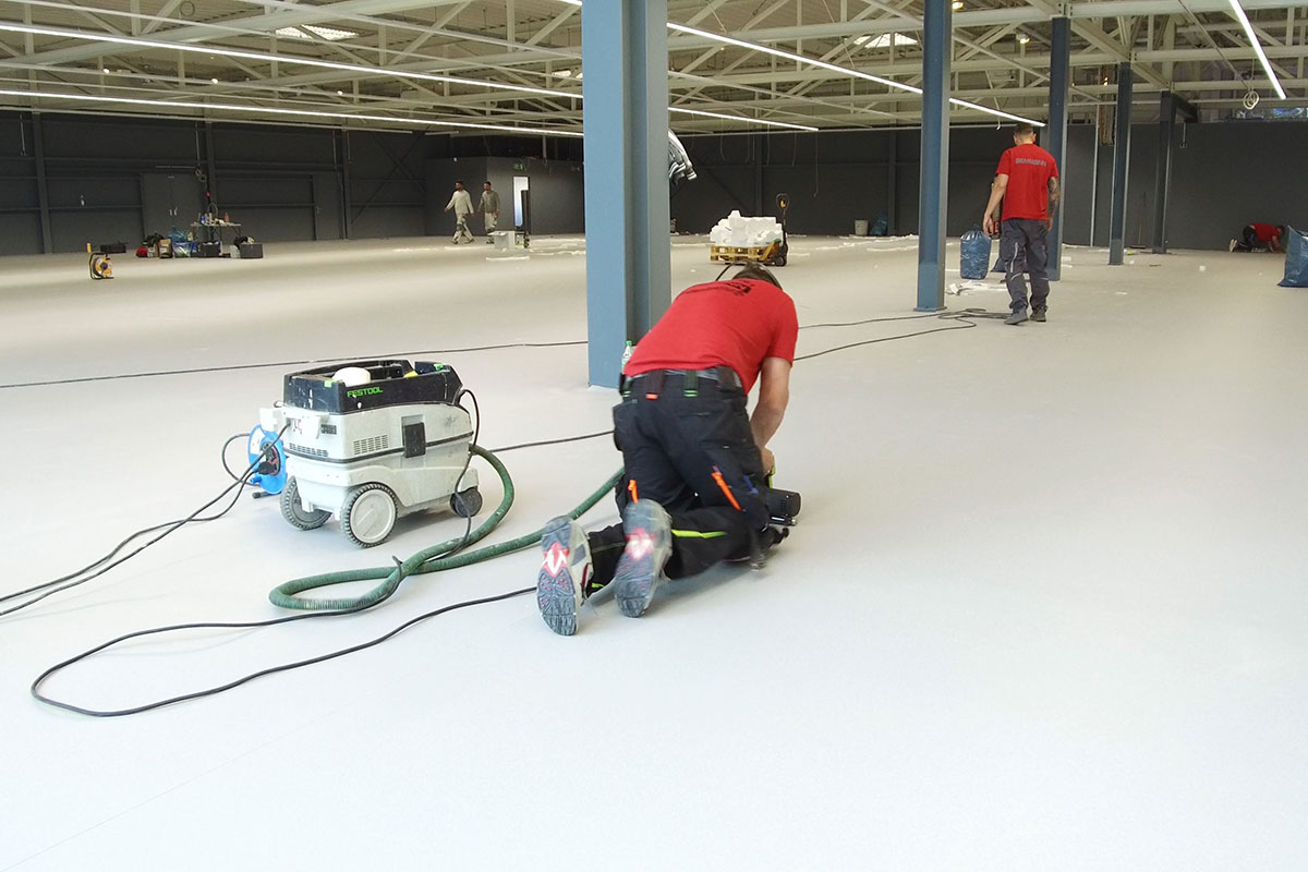 Wir haben wie versprochen in 48 Stunden eine komplette Fläche mit Altro Cantata eingelegt und danach in 12 Stunden mit 4 Bodenlegern verschweißt. Die ersten beiden Tage waren wir mit 8 Mann vor Ort. Obwohl wir baubedingt am Tag 1 erst um 12.00 Uhr anfangen konnten, haben wir es geschafft, den Belag komplett innerhalb von 1,5 Tagen in die Fläche einzubringen. Über das Wochenende hat sich der Belag legen können. So konnten wir dann am darauf folgenden Montag und Dienstag alle Bahnen verschweißen.“