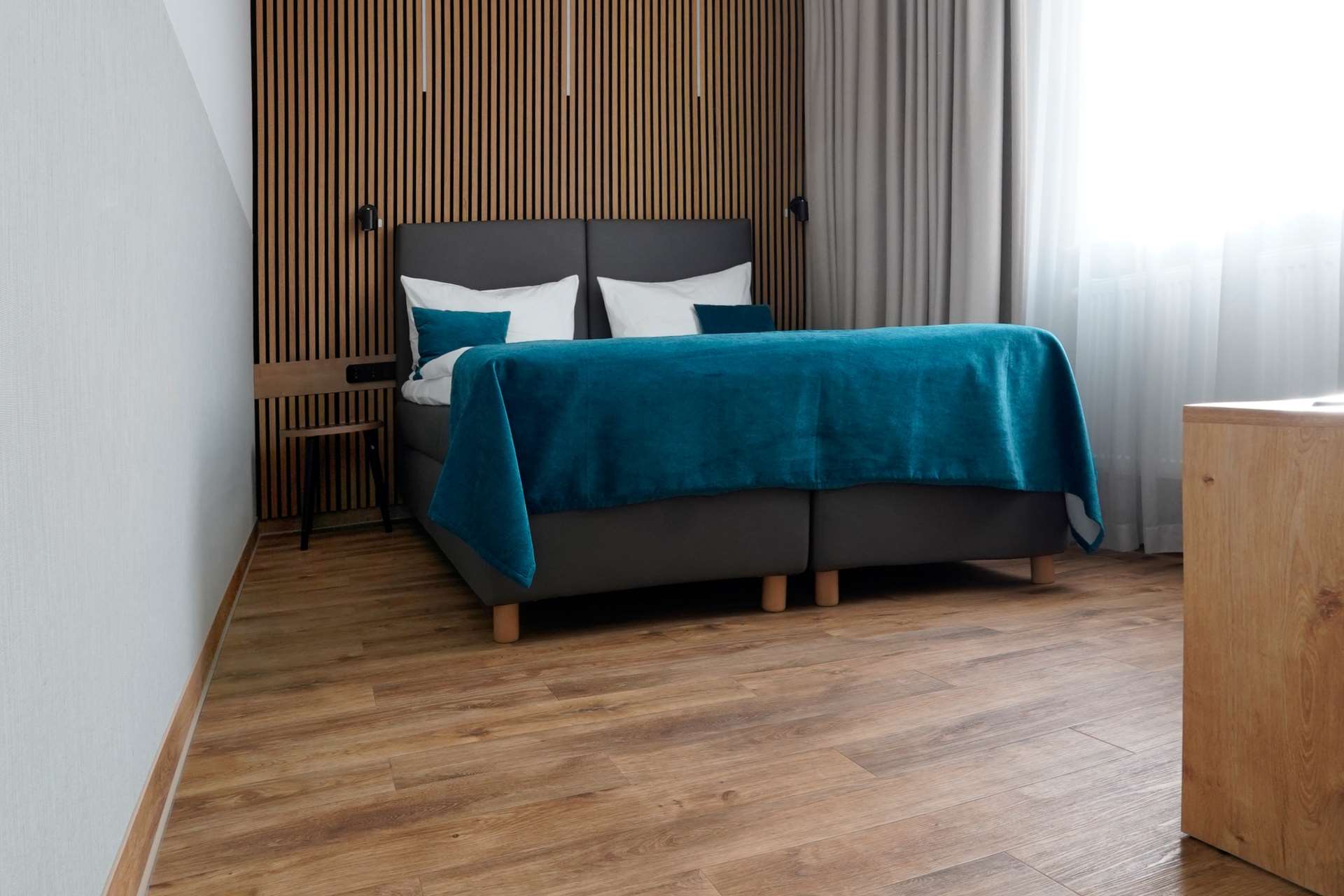 In allen Hotelzimmern – insgesamt rund 800 m² – kamen Bodenbeläge der Kollektion Altro Ensemble / M500 im Dekor Natural Striking Oak zum Einsatz. Gerade in historischen Gebäuden wie dem ehemaligen Hauptzollamt spielt der Belag seine Stärken aus. So war beispielsweise die akustische Situation aufgrund der historischen Bausubstanz eine Herausforderung: Zum einen ließ sie nur eine geringe Aufbauhöhe des Bodenbelags zu, zum anderen entsprach ihre Schalldurchlässigkeit nicht den heutigen Standards an die Raumakustik. Mit einer Aufbauhöhe von nur 2,6 mm fügt sich Altro Ensemble / M500 in die baulichen Gegebenheiten ein. Seine integrierte Trittschallreduktion von bis zu 15 dB trägt maßgeblich zu einer ruhigen, erholsamen Atmosphäre in den Hotelzimmern bei. Gleichzeitig sorgen der hohe Gehkomfort und die angenehme Haptik für ein spürbar verbessertes Aufenthaltserlebnis.