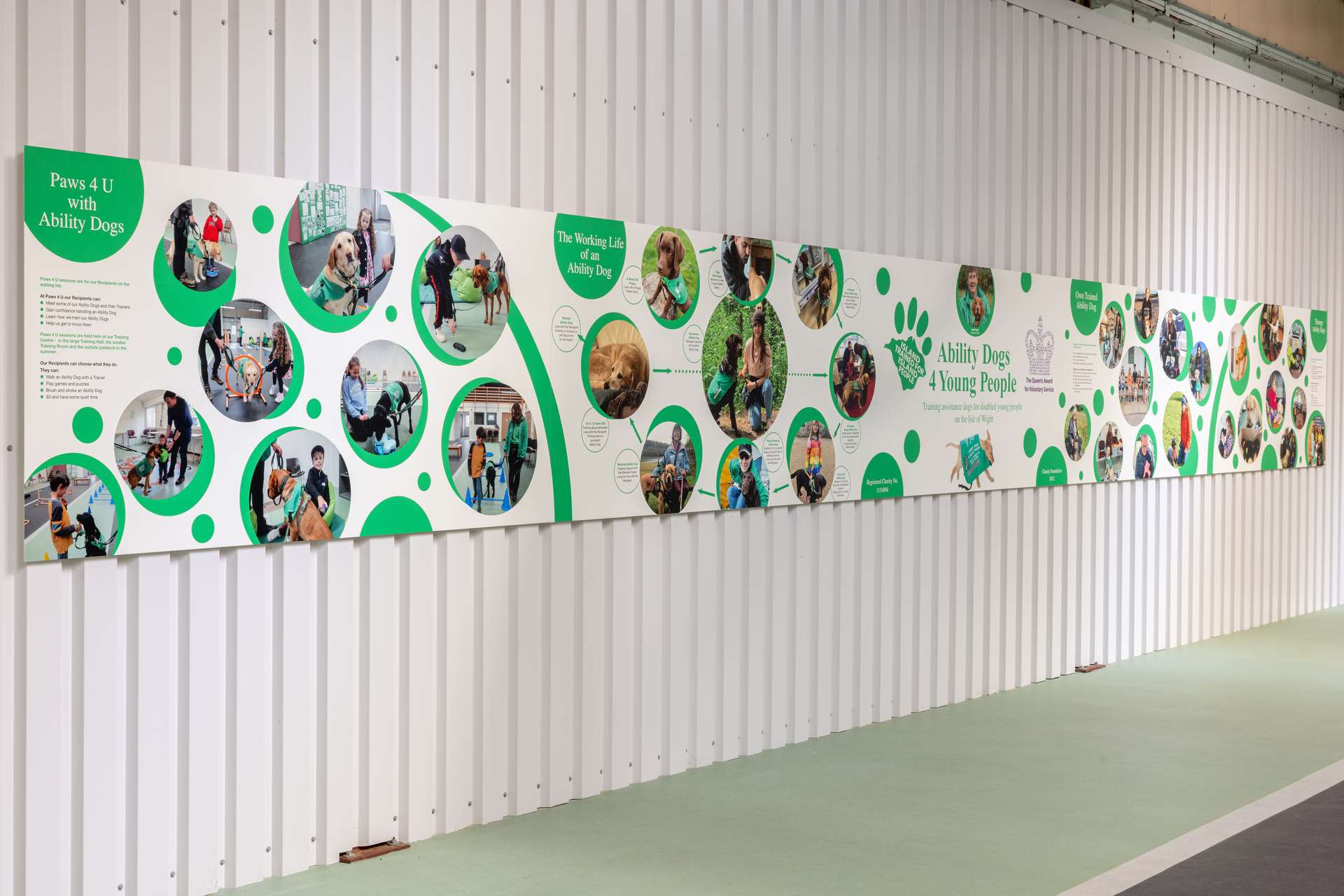 Winners of the Altro Whiterock 40th anniversary competition, Ability Dogs 4 Young People, nominated for the competition by Kevin Weatherick from Phoenix Flooring Projects Limited, wanted to bring to life a wall space within their training centre and head office. The charity trains assistance dogs to enhance the independence of disabled young people and children living on the Isle of Wight. Ability dogs help with physical and mental disabilities including cerebral palsy, autism, diabetes, and epilepsy.