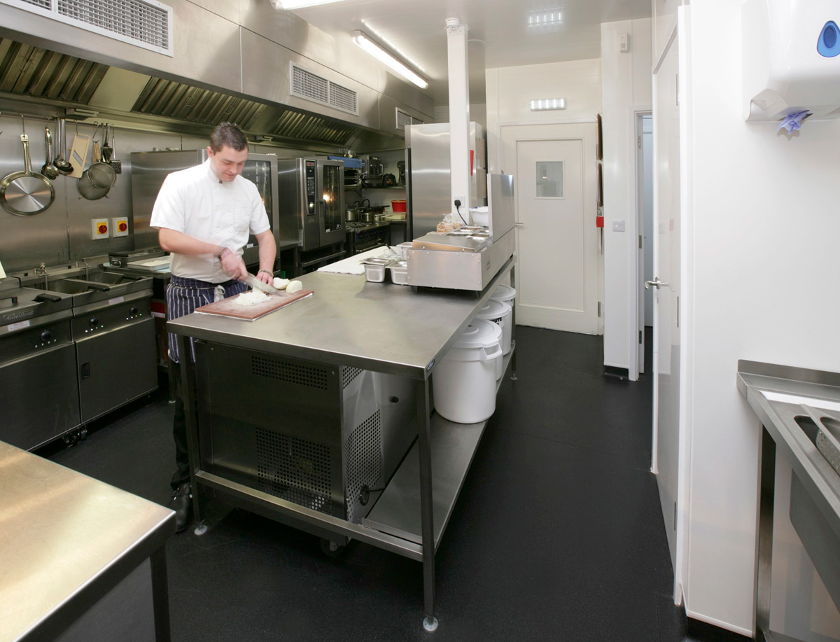 In the kitchen, Altro Stronghold 30 flooring and Altro Whiterock hygienic wall cladding were selected to provide safety and hygiene in this busy environment. These Altro systems were also continued into the seasonal outside bar and food service areas, in order to create a seamless solution with easily cleaned surfaces.